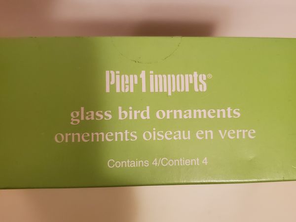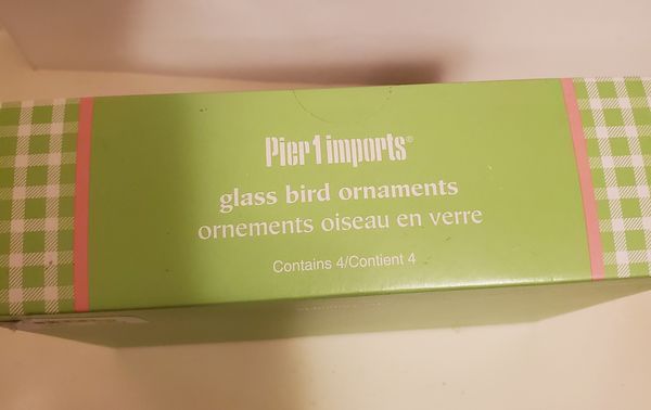 Pier 1 glass bird ornaments. Set of four multi colored bird ornaments. Each one hangs from a silk ribbon. Brand new, factory sealed.