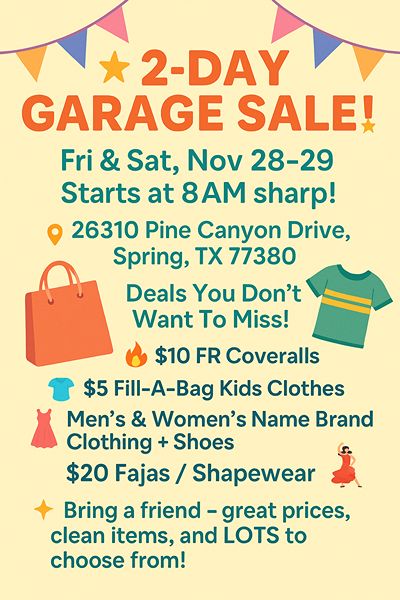 2-DAY GARAGE SALE! FR coveralls $10 Kids clothes — $5 fill-a-bag Name brand men + women clothing & shoes Fajas/Shapewear $20 26310 Pine Canyon Dr, Spring TX 77380 Fri & Sat (Nov 28–29) • 8AM Come early — stuff WILL go fast!