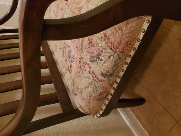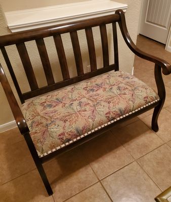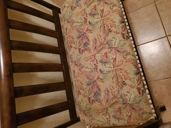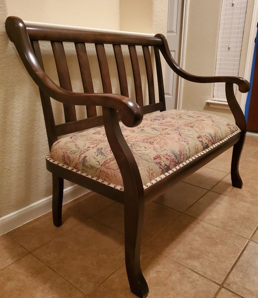 Traditional Style Settee, Armed Bench, Hall Bench, Seat , Small Couch, Traditional Style with Tapestry upholstery and dark wood with slated back and arms. The seat is in excellent condition, no stains or rips. The frame is solid in very excellent condition with very few visible scratches. Measures: 43'w x 28 1/2 d x 37 1/2 t. FTS 18'. There is a smaller Bench with matching tapestry upholstery. See all my items, buy both and save.