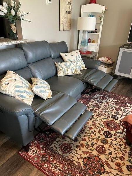 Never used beautiful blue, Cindy Crawford, full leather electric reclining sofa with USB ports for charging phones, etc. $800 negotiable. Must sell downsizing two condo.
