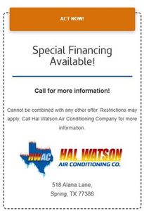 Cannot be combined with any other offer. Restrictions may apply. Call Hal Watson Air Conditioning Company for more information