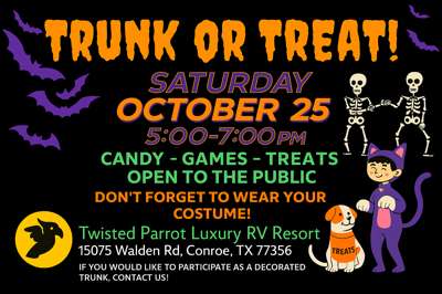 Twisted Parrot Luxury RV Resort is a big-rig friendly, family-oriented, and pet-friendly destination located right next to Margaritaville on Lake Conroe. Along with our resort-style pool, hot tub, poolside bar, and games for all ages, we’re bringing the community together this Halloween for a night of festive fun.