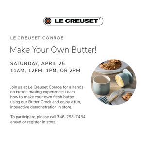 Join us at Le Creuset Conroe for a hands-on experience learning to make delicious fresh butter! We'll feature some of our favorite kitchen essentials like the Le Creuset Butter Crock-a must have for bread lovers. Classes at 11,12,1 and 2 pm on Saturday, April 25th. Join in the fun....it's free!