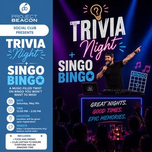 Join Project Beacon Social Club for a high energy afternoon of Trivia Night and Singo Bingo, a music based twist on bingo that keeps everyone engaged and having fun. This event is designed for adults with autism or other neurodiversities to build meaningful relationships with like minded peers in a structured and welcoming environment.