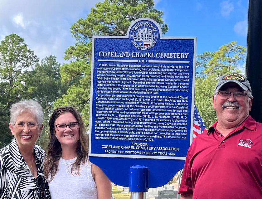 MONTGOMERY, TX -- The 129 year old Historic Copeland Cemetery, located off of McCaleb Road, on Copelan Chapel Road (correct spelling, you’d think after over 100 years, that someone would have bothered to correct the misspelling by now), was recently heralded by the Montgomery County Historical Commission as historic this past Saturday, seeing as nearly one-thousand citizens who have gone on the great beyond now call the place home. In 1896, when farmer Napoleon Bonaparte Johnson purchased land for his large Louisiana born family, one nearby sharecropper Nat Gibbs, and his wife Joana, suffered the loss of a child in August. Mr Johnson, kindly provided a small piece of his land to accommodate Baby Gibbs burial.