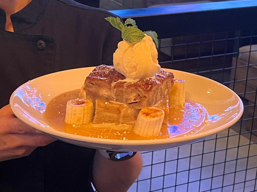 No end to an On The Kirb experience would be complete without dessert. OTKs Banana Bread Pudding, can be enough for one super-hungry, or four, some say six fellow diners, looking to share an incredibly delicious closing dish. And since bananas (albeit carmelized) are included, even a scholar would conclude that it's healthy. Wink wink, lol. Of course it's pure decadence! The bread pudding can be described as an overlapping two squared dessert, topped with ice cream and mint sprig, smothered with the famous bananas foster sauce. It is a rich and delicious end to an awesome meal, and is worthy of its prime placement on the OTKs dessert menu.