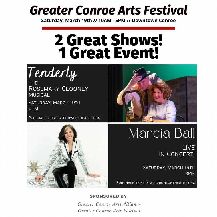 There are two ticketed events as part of the Greater Conroe Arts Festival: “Tenderly, the Rosemary Clooney Story” and Marcia Ball. “Tenderly, the Rosemary Clooney Musical will be at the Owen Theatre at 2:00pm during the festival hosted by The Players Theatre Company. Tickets can be purchased online at www.OwenTheatre.com.