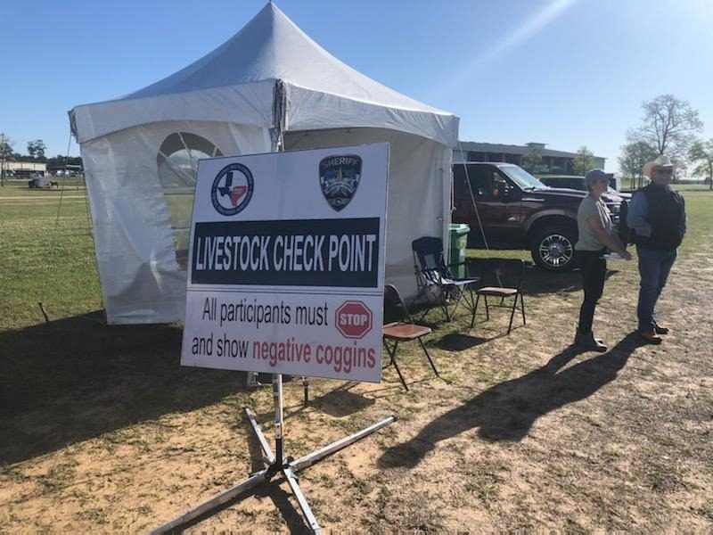 Proof of a negative Coggins is a requirement under state law to enter and participate in a county-sanctioned equine event. Participants who arrive at the check station without valid Coggins paperwork will not be allowed to enter and could be issued a class C misdemeanor citation. If there are any questions before arrival, you may contact a Livestock Deputy at 936-760-5800.