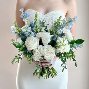 Our premium bridal bouquets are our deluxe and over-sized bouquet option. Artfully arranged and composed in a loose, natural, and organic style and adorned with ribbon. Our upgraded bridal bouquets are approximately 16-18" at the widest point and 12-14" from top to bottom.