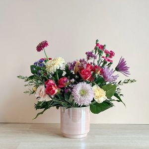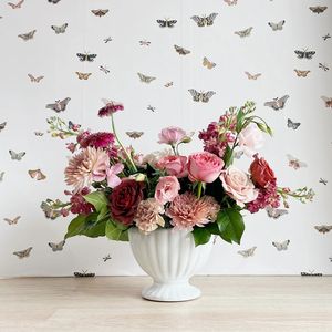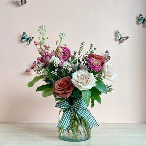 Lush and romantic, Enchanted Chrysalis is a captivating showcase of layered pink blooms in every shade. Featuring Pink/Mauve Stock, Pink Lisianthus, Razzmatazz Roses, Pink Spray Roses, Pink Xpression Roses, Pink Mums, Pink Quicksand Roses, Hot Pink Gerbera Daisies, and Pink Carnations, this arrangement creates rich texture and vibrant dimension.