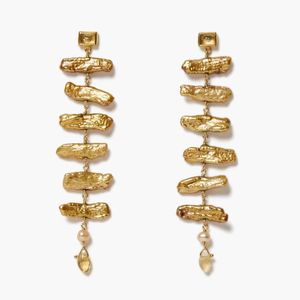 18k gold plated sterling post back earrings featuring bezel wrapped citrine and cascading biwa pearls. 3 1/4in. drop.